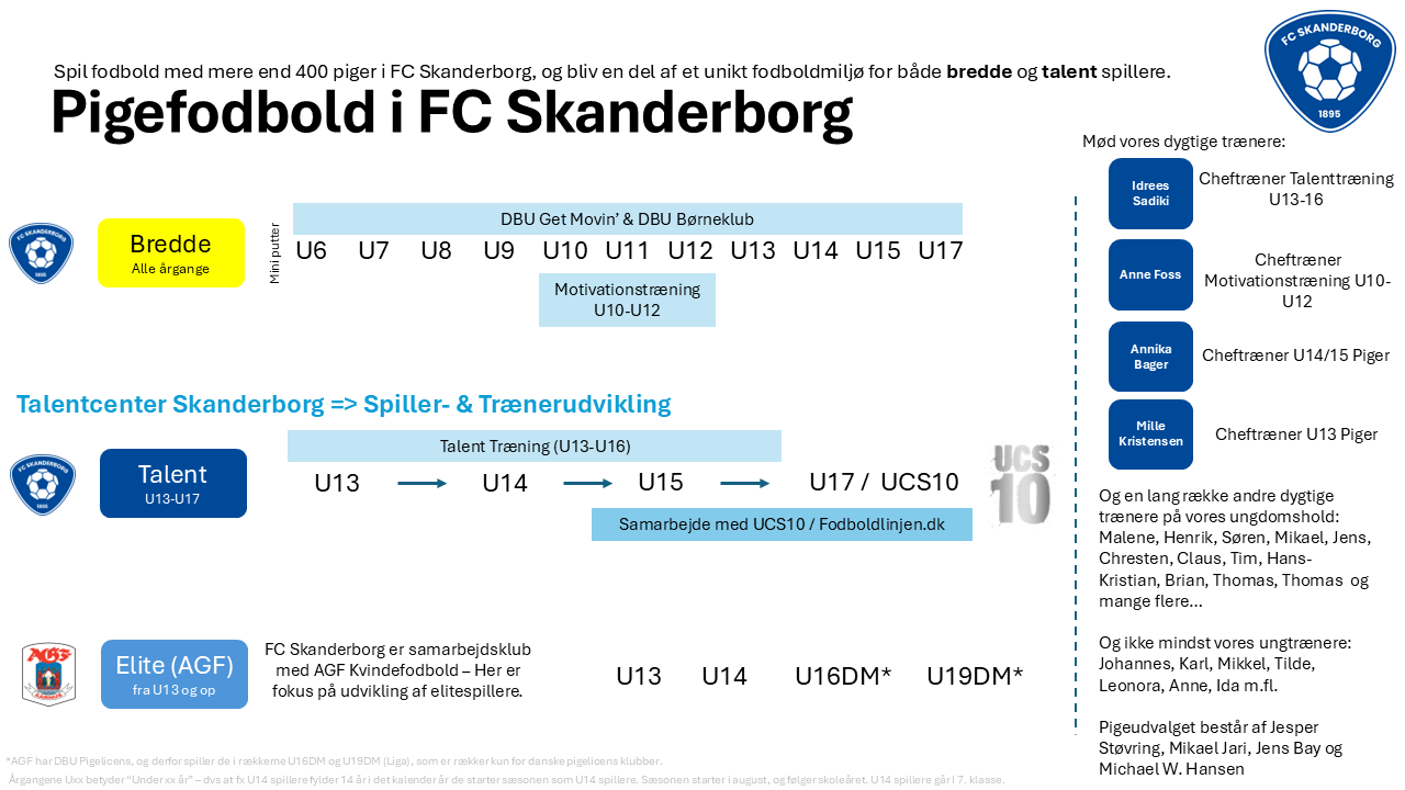 Samarbejdet med UCS10 / Fodboldlinjen.dk udvides nu omkring opbygning af U17 Pigetalent fodbold. I dag findes dette samarbejde på drenge-siden, men nu udvides samarbejdet om spiller- og trænerudvikling med UCS10 om også at inkludere pigefodbold. Samarbejdet kommer på forskellige måder til at smitte af på alle vores ungdomshold fra U13 til U17. Det er svært at tydeliggøre hvor stærk et fodboldtilbud UCS10 leverer til deres elever, men læs selv mere herom på Fodboldlinjen.dk